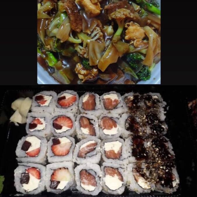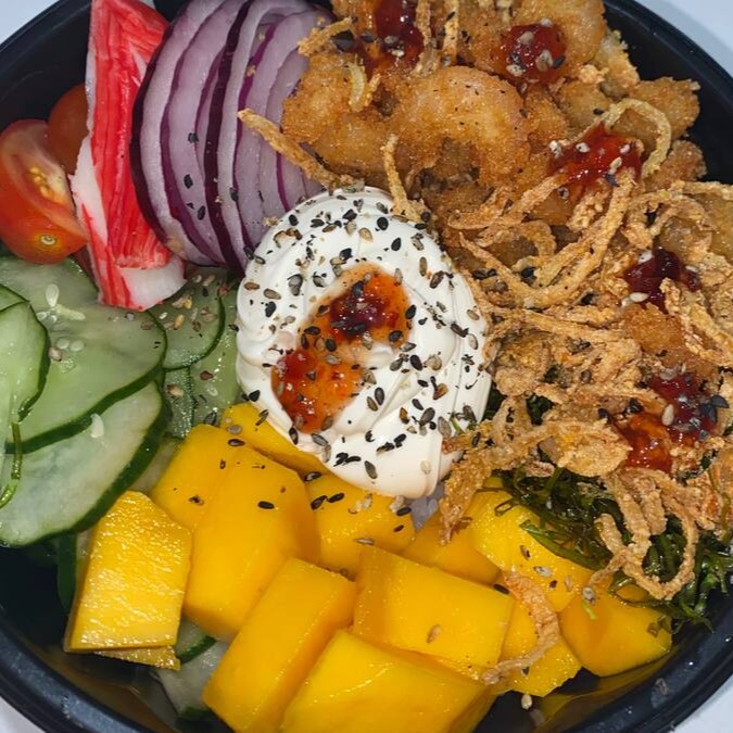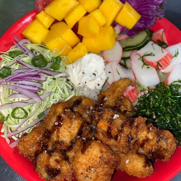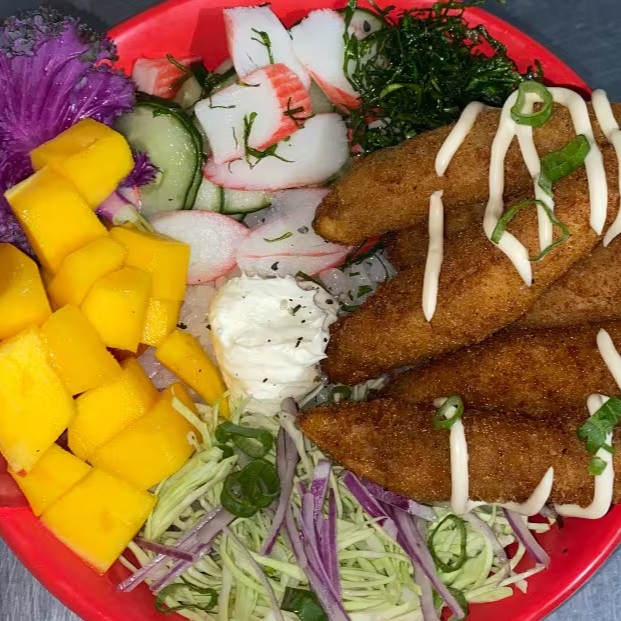 Base de shari(arroz japonês)Tilápia em tiras empanadas na farinha panko,crispy de couve,kani-kama,cebola roxa,sunomono,manga,tomate e cream chesse e repolho (acompanha 1 par de hashi e 2 saches de moho shoyu,não acompanha molho tarê)