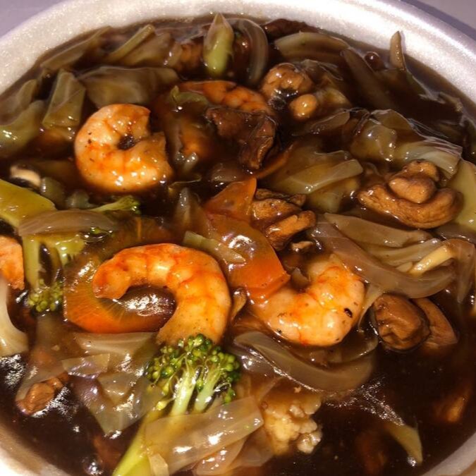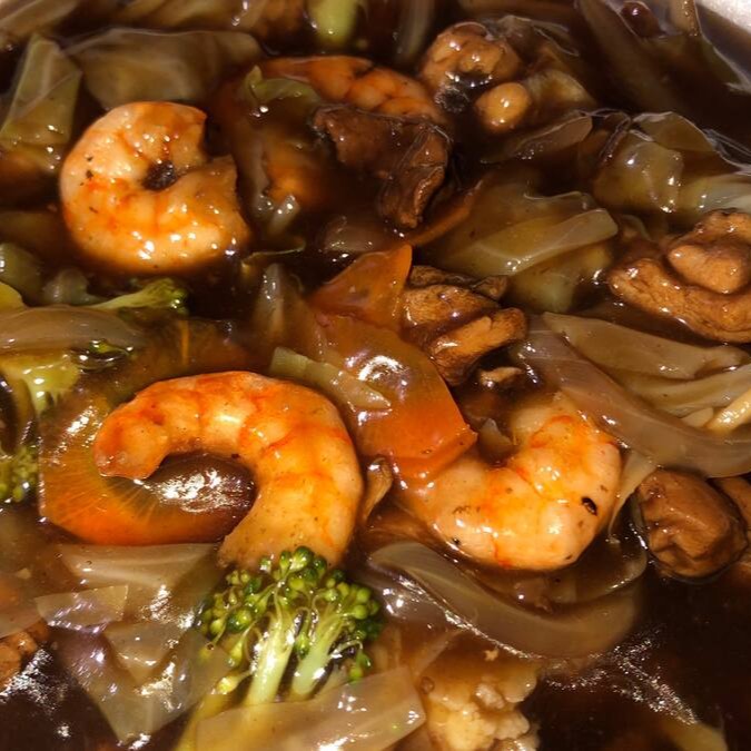 Camarão,legumes,cebola,macarrão de yakisoba,e molho oriental.