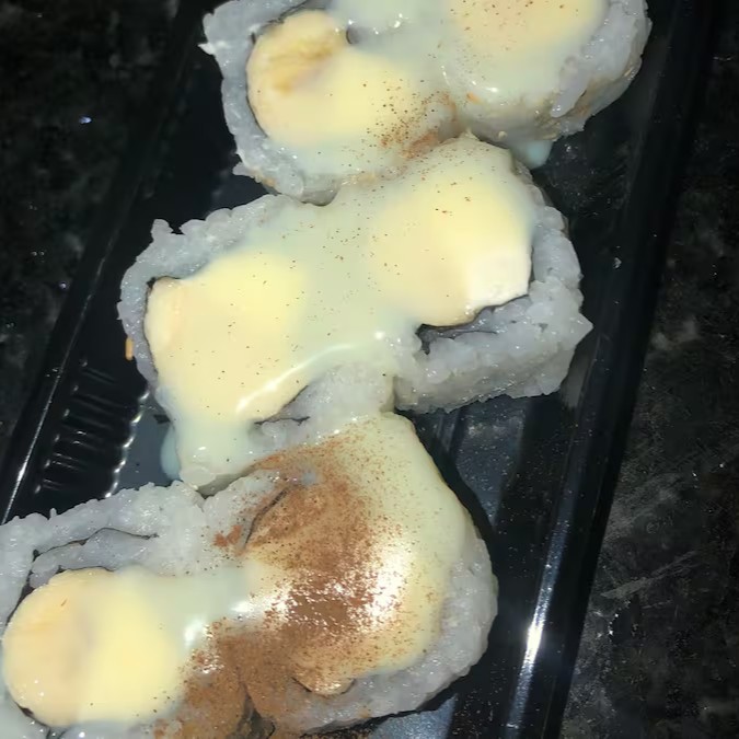 temaki cortado ao meio com salmão,cream chesse,por cima cream chesse,cebolinha e molho tarê