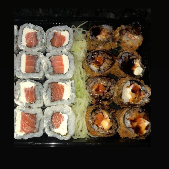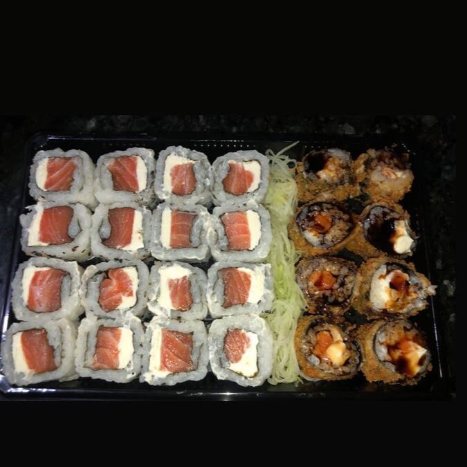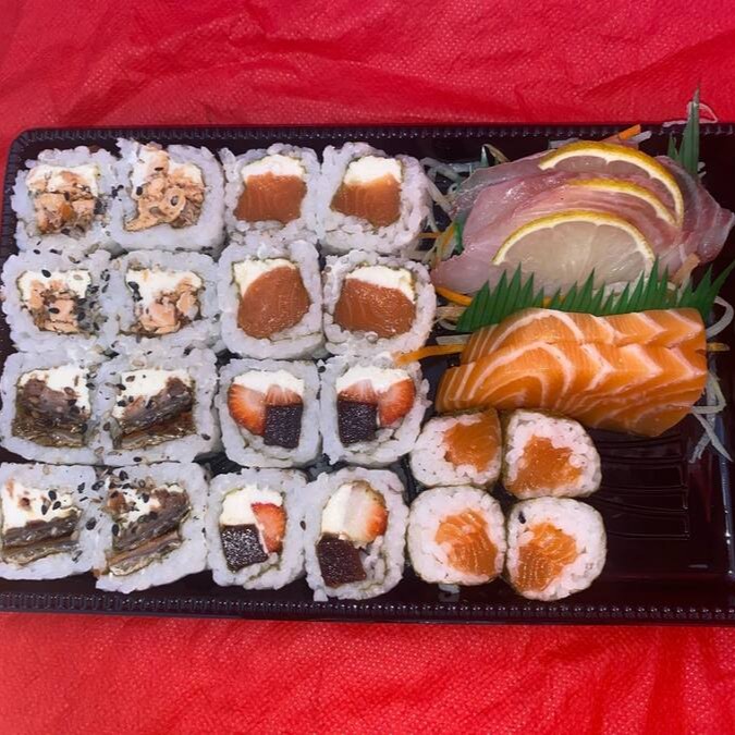 6 sashimi salmão, 6 sashimi peixe branco, 4 uramaki skin, 4 uramaki Filadélfia ,4