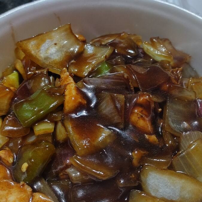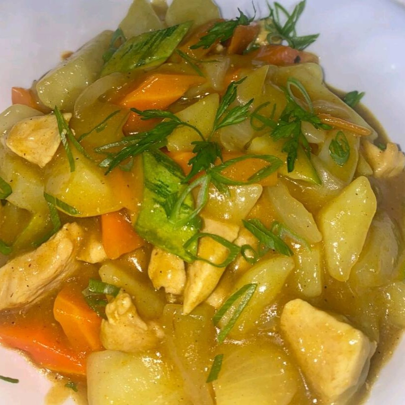 Frango,batata,cenoura,cebola,molho curry (levemente picante)companha arroz,700 gramas