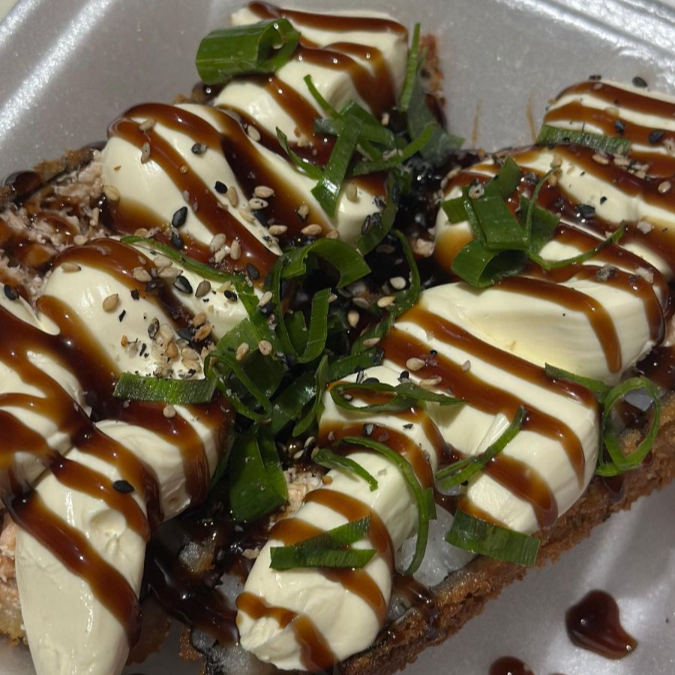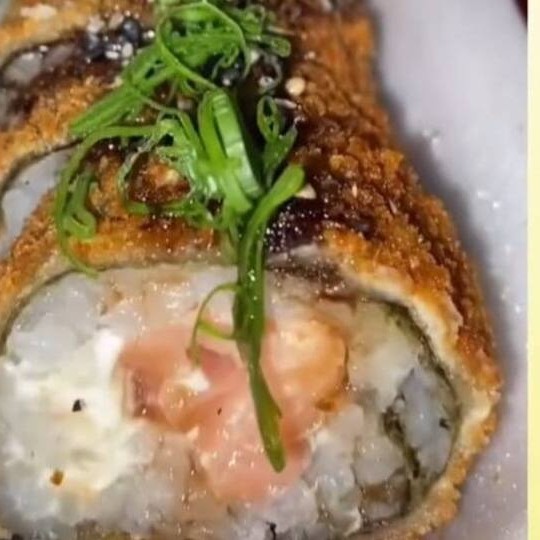 temaki com salmão e cream chesse todo frito,cortado ao meio com cream cheese em cima,cebolinha e molho tarê.