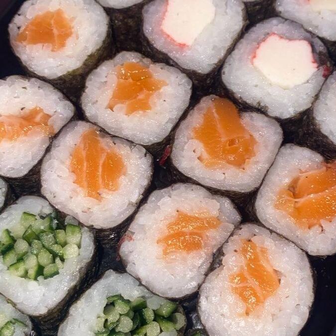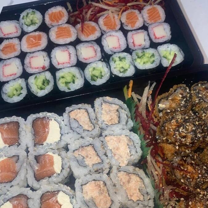 8 hossomaki de pepino,8 hossomaki de salmão,8 hossomaki de kani-kama,8 hot filadélfia,8 uramaki salmão grelhado,8 uramaki filadélfia.