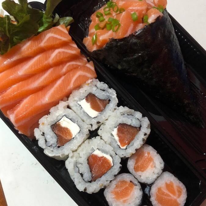 Combinado salmão simples 12 peças) 4 sashimis de salmão,4 uramaki filadélfia,4 hossomaki de salmão + 1 temaki filadélfia(salmão em cubos com cream chesse) se preferir o temaki com cebolinha favor adicionar na observação!!