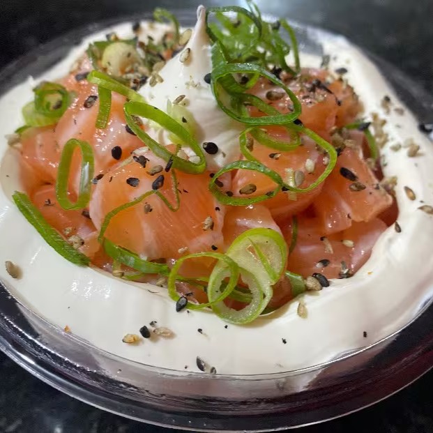 Base de arroz,uma camada bem generosa de salmão cru em cubos intercaladas com cream chesse por cima cebolinha e gergelim.