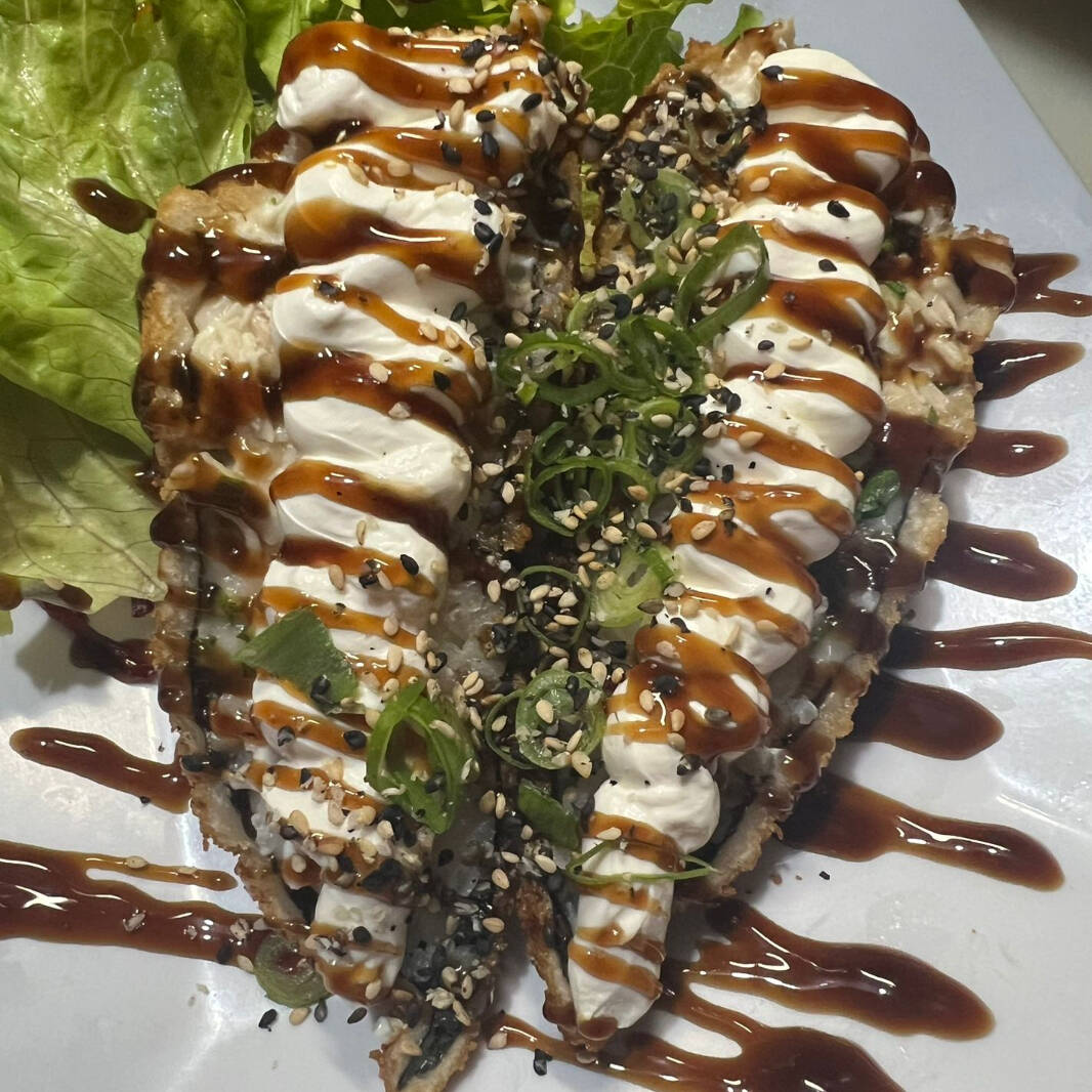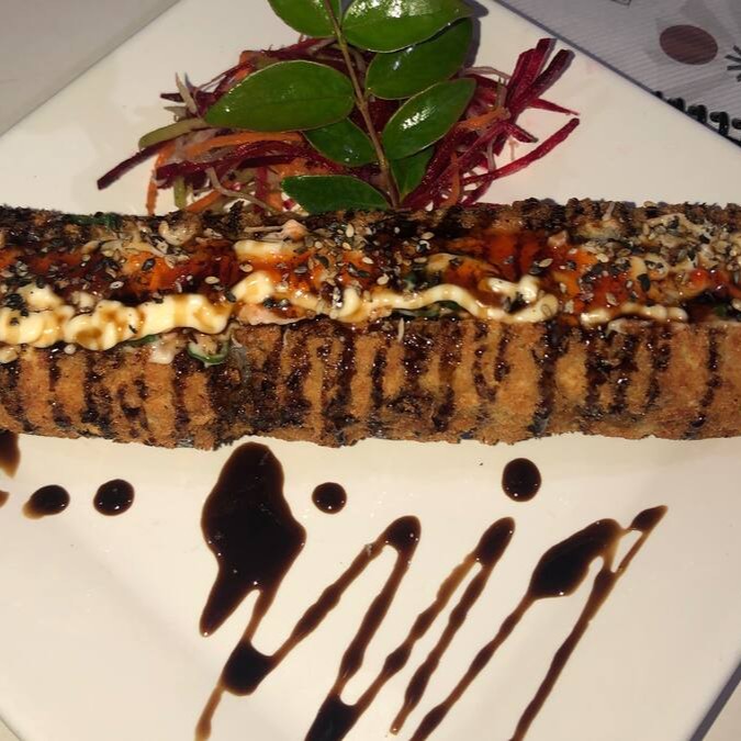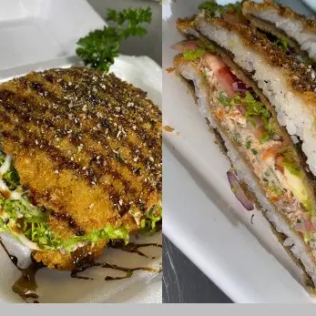 "pão feito com arroz de sushi empanado na farinha panko"recheio de pate de salmão com helmanss e cebolinha,alface,tomate,cebola roxa,Por cima molho tarê e gergelim