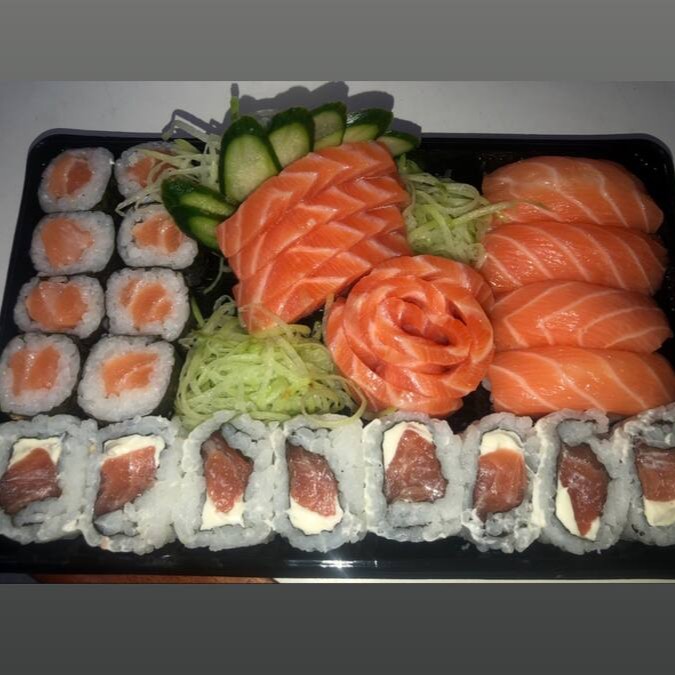 8 sashimi salmão, 8 uramaki filadélfia, 8 hossomaki salmão, 4 niguiri salmão