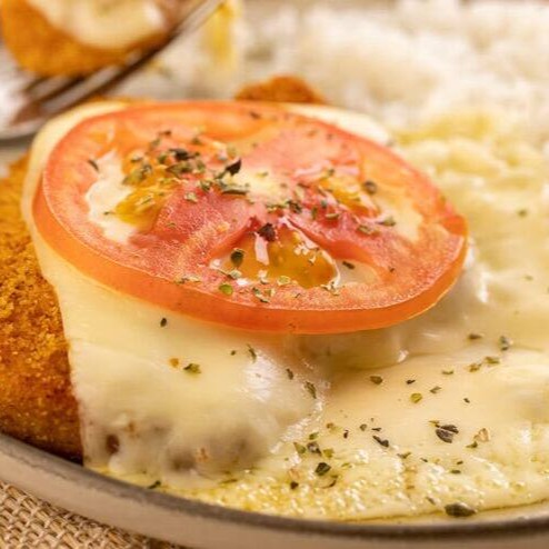 Steak de Frango industrializado, Molho de tomates, Queijo Mussarela, Arroz, Feijao Preto e Fritas