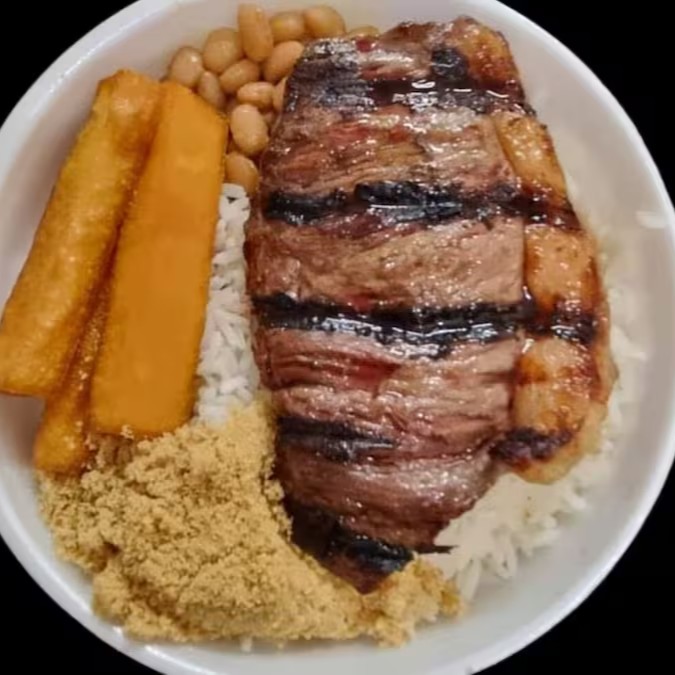 Acompanha: arroz, feijão, polenta frita, farofa, uma fatia de picanha e uma maionese (não fazemos trocas ou substituímos o produto