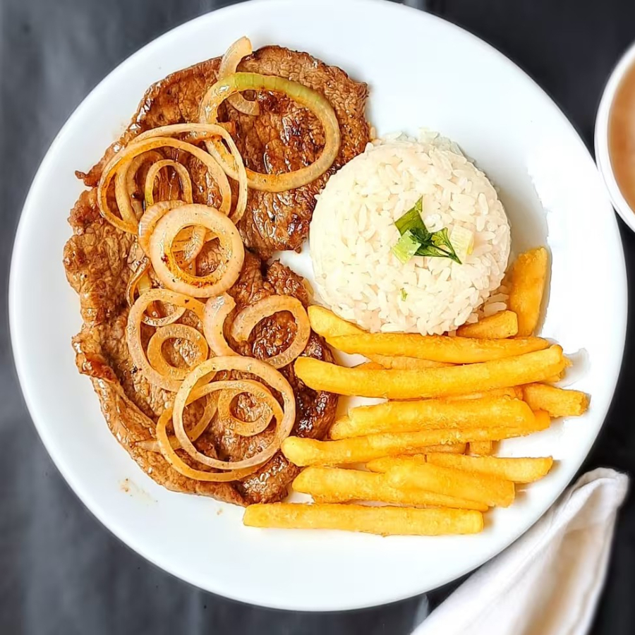 Arroz,farofa, salada, batata frita e o delicioso filé com mignon