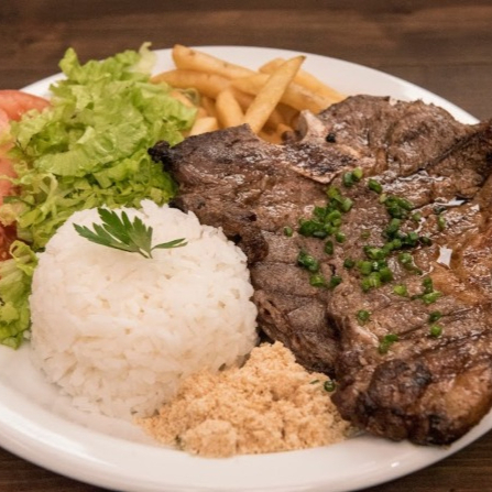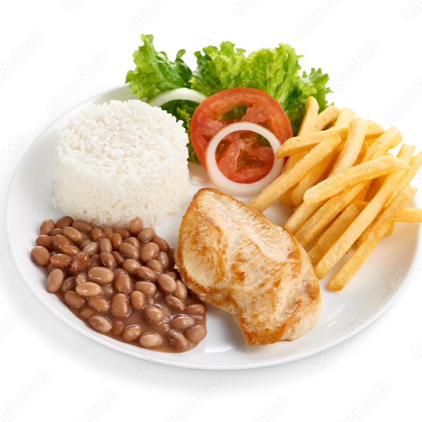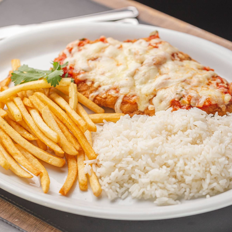 Porção de arroz, feijão, salada, fritas e Delicioso Parmegiana de carne ou de frango. Favor fazer a escolha da carne em observação.