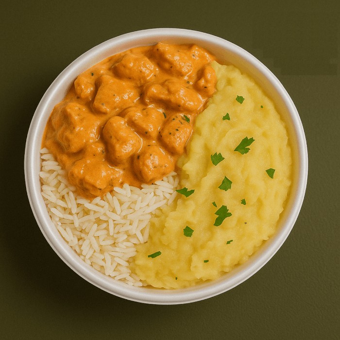 Clássico cremoso e irresistível! Strogonoff de frango com pedaços suculentos, preparado com molho cremoso à base de creme de leite, ketchup e mostarda, acompanhado de arroz branco soltinho e purê de batatas macio e saboroso. Uma refeição completa, equilibrada e com o toque de comida caseira que faz a diferença!