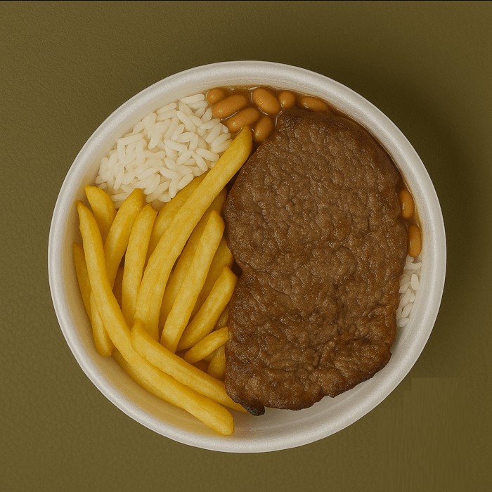 Delicioso bife grelhado no ponto certo, suculento e bem temperado, acompanhado de arroz branco soltinho, feijão branco saboroso e batatas fritas crocantes. Uma refeição clássica, farta e com aquele sabor de comida caseira que você adora!