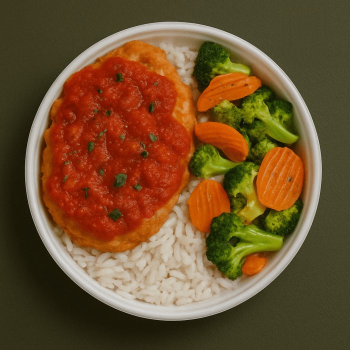 Frango Parmegiana com Legumes Delicioso filé de frango empanado na massa crocante, coberto com molho de tomates caseiro e queijo derretido, acompanhado de arroz branco soltinho e mix de legumes frescos e bem temperados. Uma refeição equilibrada, saborosa e com aquele toque especial de comida caseira.
