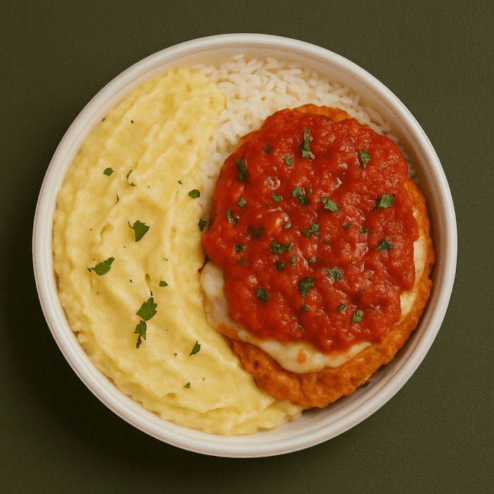 Clássico irresistível! Filé de frango empanado na massa crocante, coberto com molho de tomates caseiro e queijo derretido, acompanhado de arroz branco soltinho e purê de batatas inglesas cremoso. Uma combinação perfeita de sabor, textura e comida caseira de verdade, preparada com todo o cuidado.