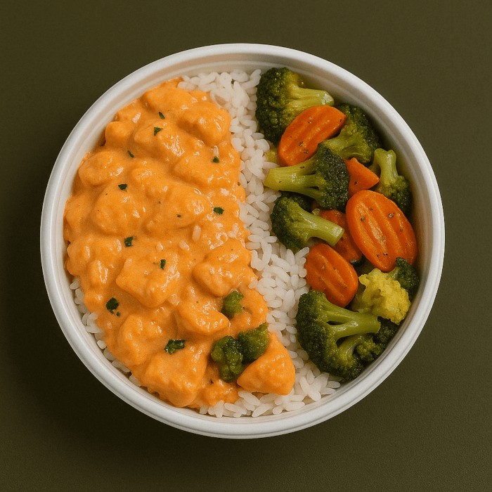 Delicioso strogonoff de frango cremoso, preparado com pedaços de frango selecionados e molho à base de creme de leite, ketchup e mostarda, acompanhado de arroz branco soltinho e mix de legumes frescos e bem temperados. Uma refeição leve, saborosa e com o autêntico sabor caseiro!