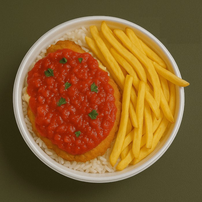 Clássico que todo mundo ama! Filé de frango empanado na massa crocante, coberto com molho de tomates artesanais e queijo derretido, acompanhado de arroz branco soltinho e batatas fritas douradinhas. Uma marmita saborosa, farta e com aquele toque de comida caseira que conquista!