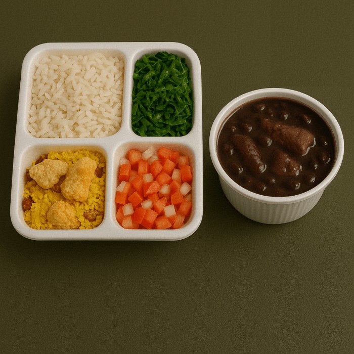 Sabor autêntico da feijoada brasileira! Marmita com feijoada magra feita com costelinha, linguiça calabresa e lombinho, acompanhada de arroz branco soltinho, couve refogada, farofa crocante e torresmo sequinho. Uma refeição completa, saborosa e com aquele tempero caseiro!