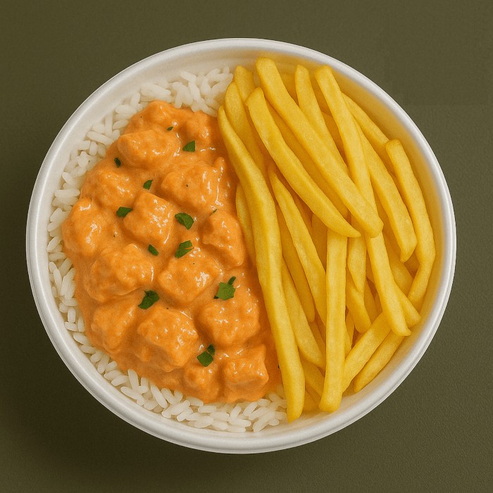 Clássico brasileiro que todo mundo ama! Strogonoff de frango cremoso, feito com pedaços de frango selecionados e molho à base de creme de leite, ketchup e mostarda, acompanhado de arroz branco soltinho e batatas fritas crocantes. Uma refeição irresistível, saborosa e com o toque caseiro!