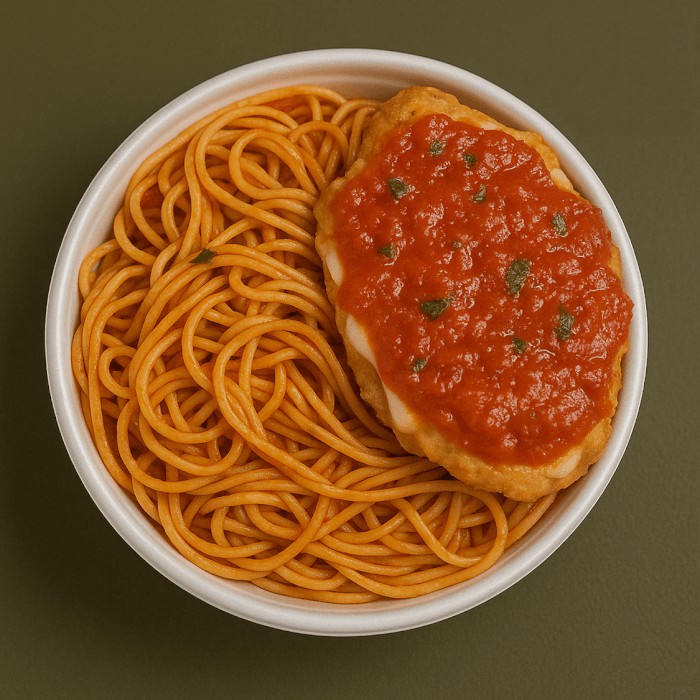 Delicioso filé de frango empanado na massa crocante e dourada, acompanhado de macarrão espaguete ao molho de tomates caseiro e saboroso. Uma combinação perfeita de frango e massa, com o autêntico sabor de comida caseira que conquista todos os paladares!