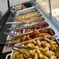Marmitex de Frango empanado com queijo derretido e molho de tomate, arroz, feijão, farofa caseira, legumes refogados e macarrão.