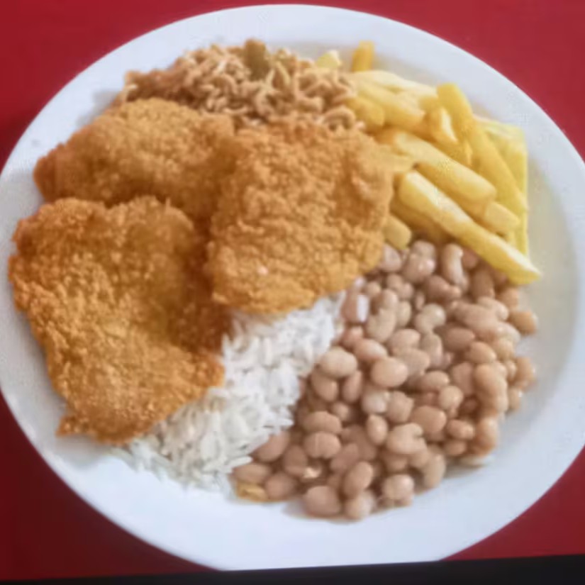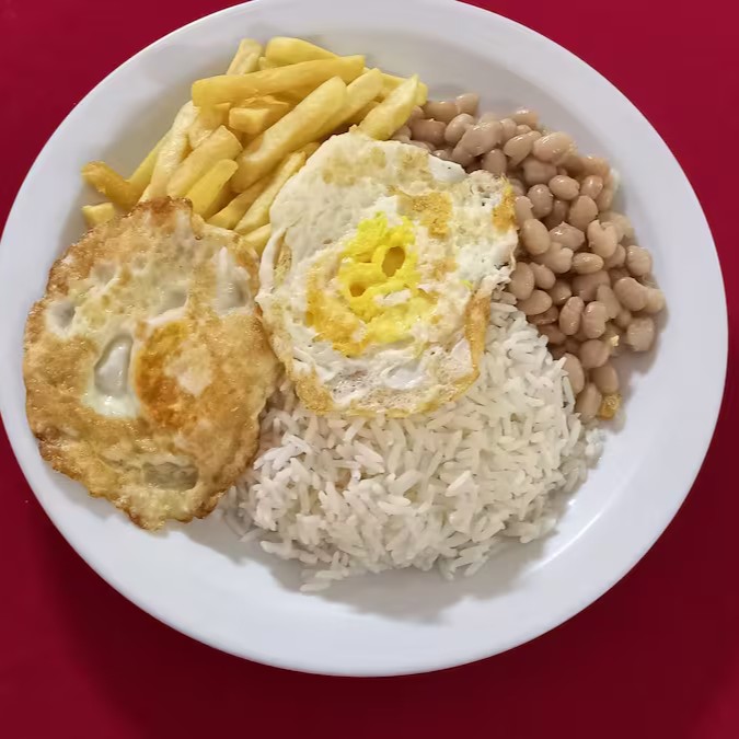 Arroz, feijão, batata e dois ovos fritos
