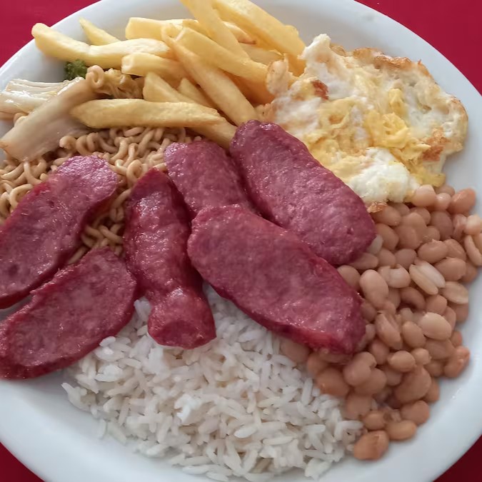Arroz,feijão,batata,macarrão de yakisoba,calabresa,ovo e saladas