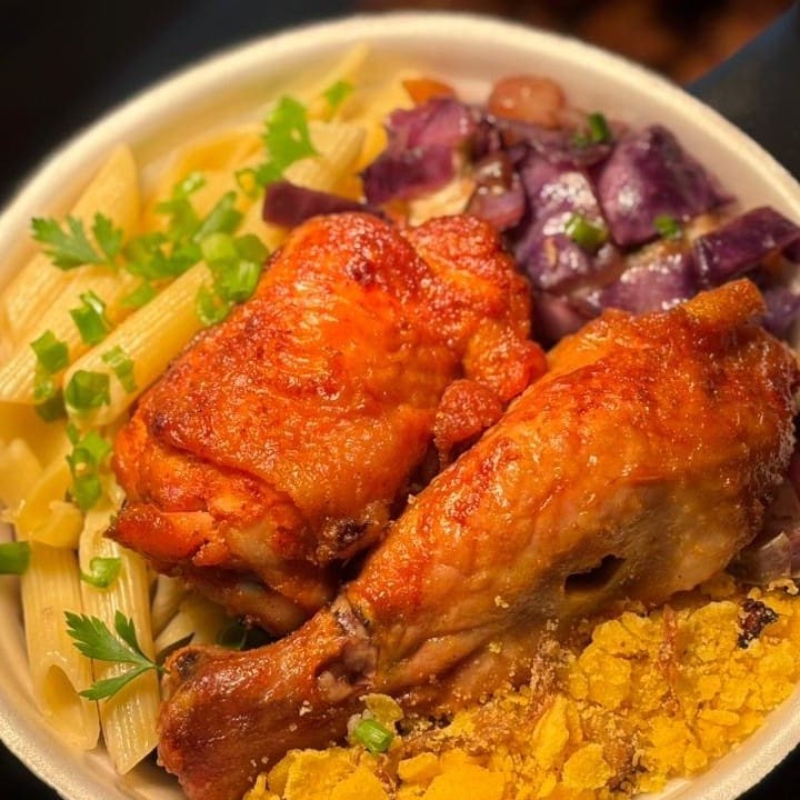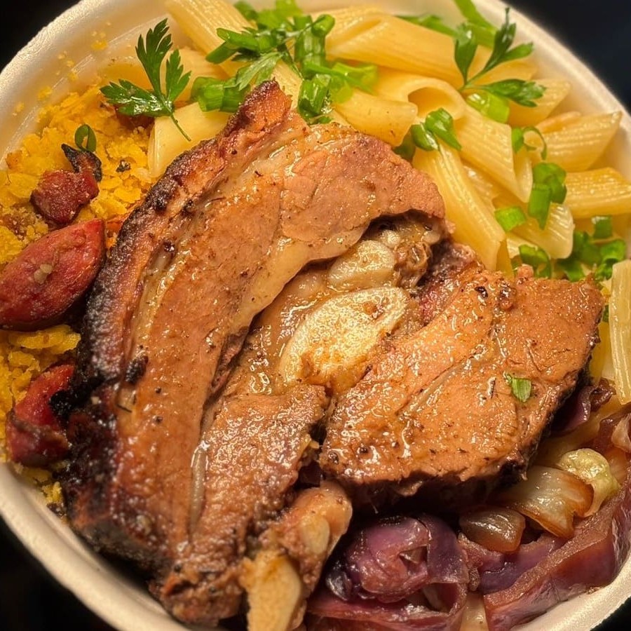 Deliciosa marmitex com coxa sobre coxa feito na churrasqueira, acompanhado de arroz soltinho, feijão preto, macarrão, legumes, farofa e bolinho de arroz. Uma refeição completa e saborosa!