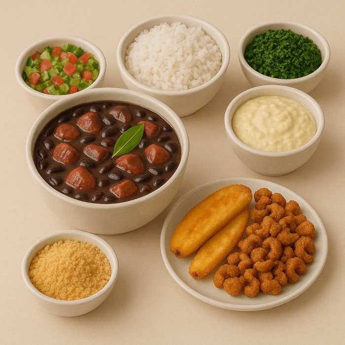 1 Marmita G com feijoada especial + 1 Marmita M com arroz + 1 Marmita M com banana a milanesa, couve e farofa + 1 Pacotinho de Torresmo + 1 Potinho de Maionese + 1 Potinho de Salada.