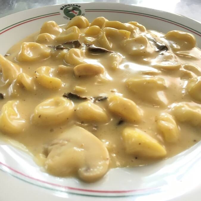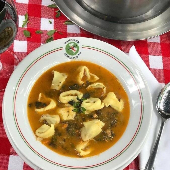 Massa artesanal recheada com carne moída num molho Brodo caseiro feito totalmente de ingredientes naturais. Acompanha pão italiano fatiado