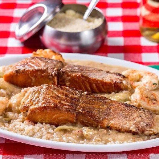 Grelhado, camarões, molho a base de maracujá com damascos. Acompanha risoto de camarões com amêndoas, tomate seco e gorgonzola