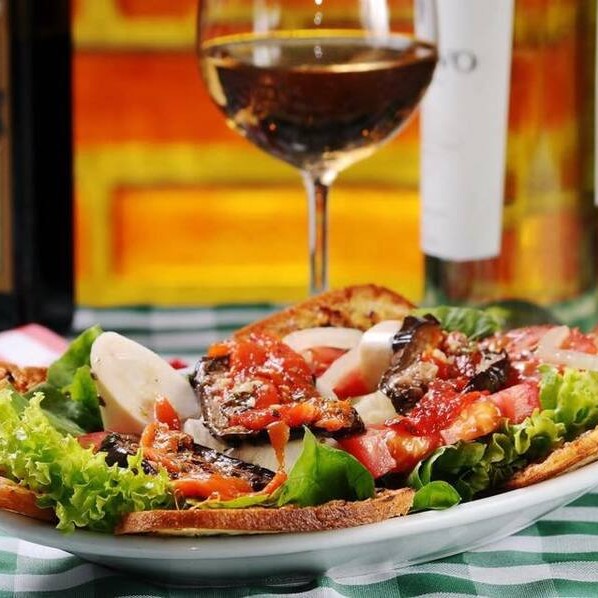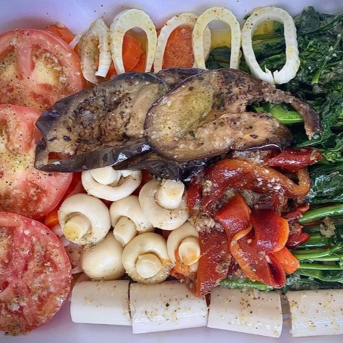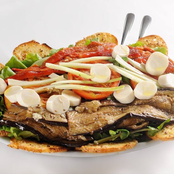 Tomate, erva-doce, palmito, cebola, cenoura, brócolis, berinjela, pimentão e torradas de alho