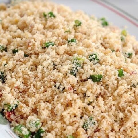 Farofa com salsinha, azeitonas, cebolinha, bacon e calabresa.