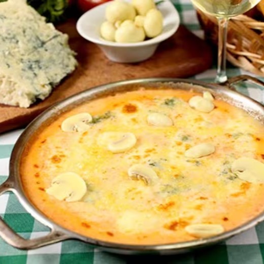 Molho branco, gorgonzola, parmesão, provolone e Catupiry