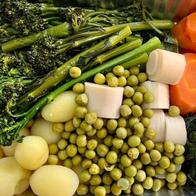 Brócolis, ervilha, batata, palmito, espinafre, cenoura