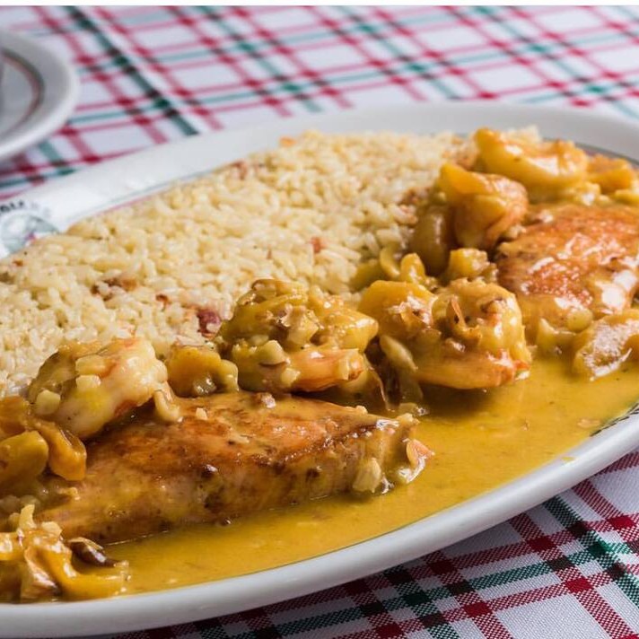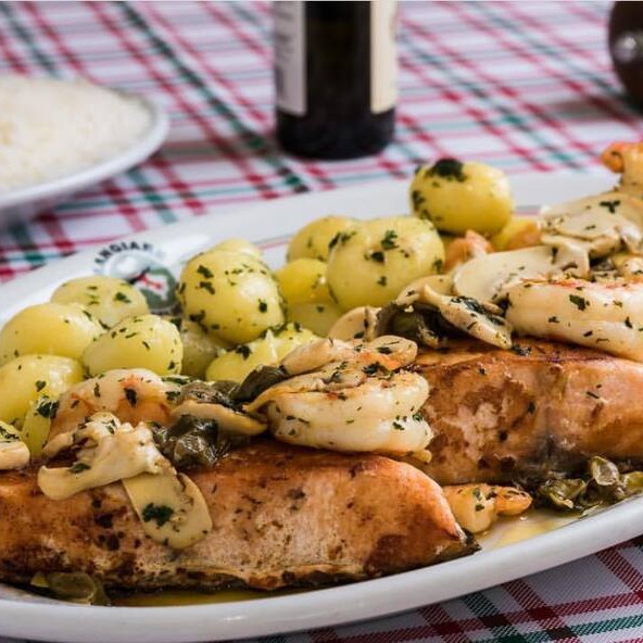 Grelhado, camarões grandes e pequenos, champignon e alcaparras puxados na manteiga. Acompanha arroz e batata soutê