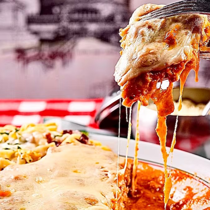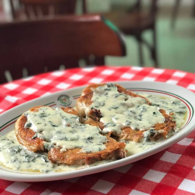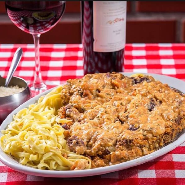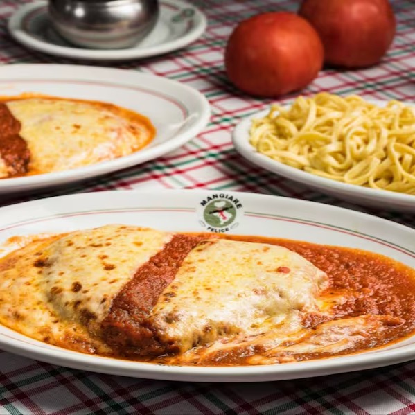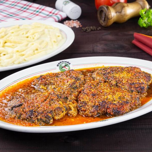 Empanado à milanesa coberto com molho sugo, gratinado com muçarela. Acompanha tagliarine à carbonara.