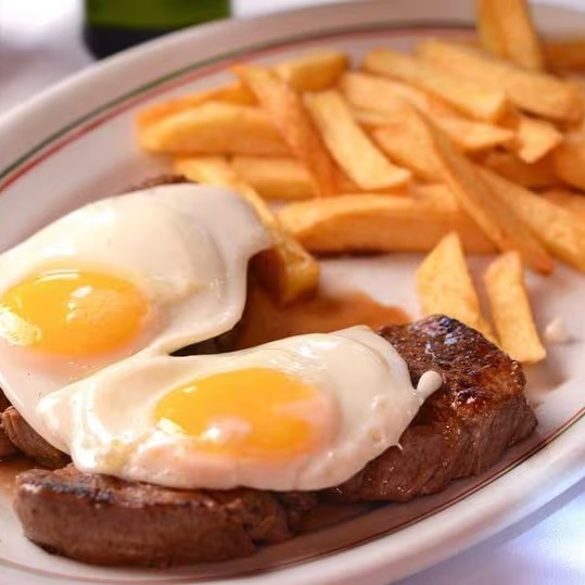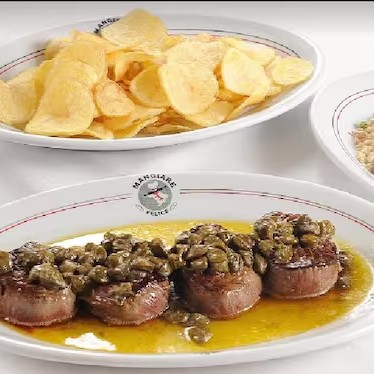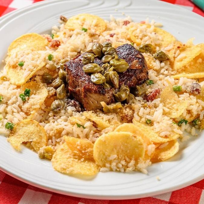Medalhão de filet mignon grelhado na manteiga com alcaparras. Acompanha uma mistura de arroz, farofa e batatas fritas à portuguesa.