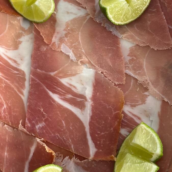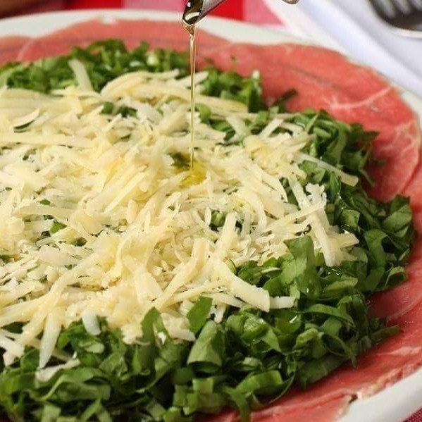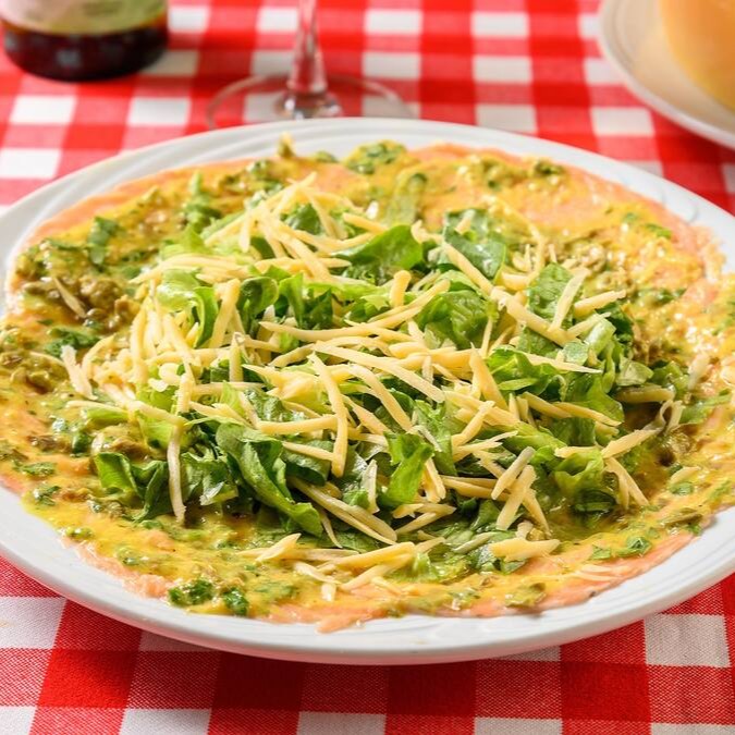 Finas fatias de carne bovina com molho caseiro a base de ervas. Rúcula fresca e parmesão. Acompanha tortas de alho