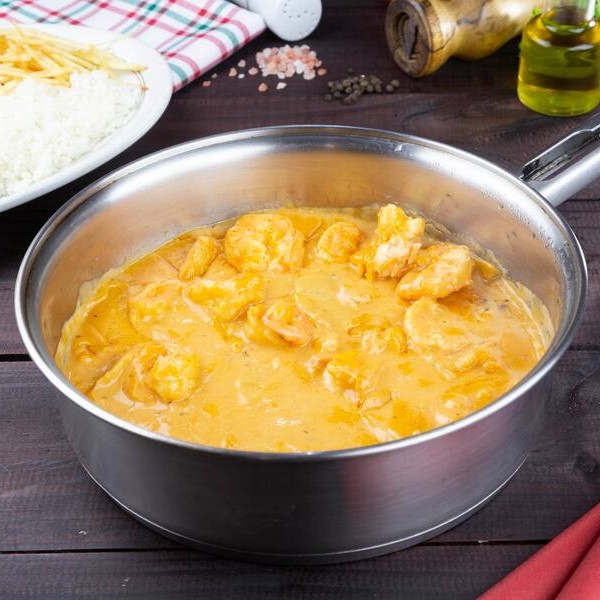 Creme de leite, catchup, flambado com maçã e whisky. Acompanha arroz e batata palha