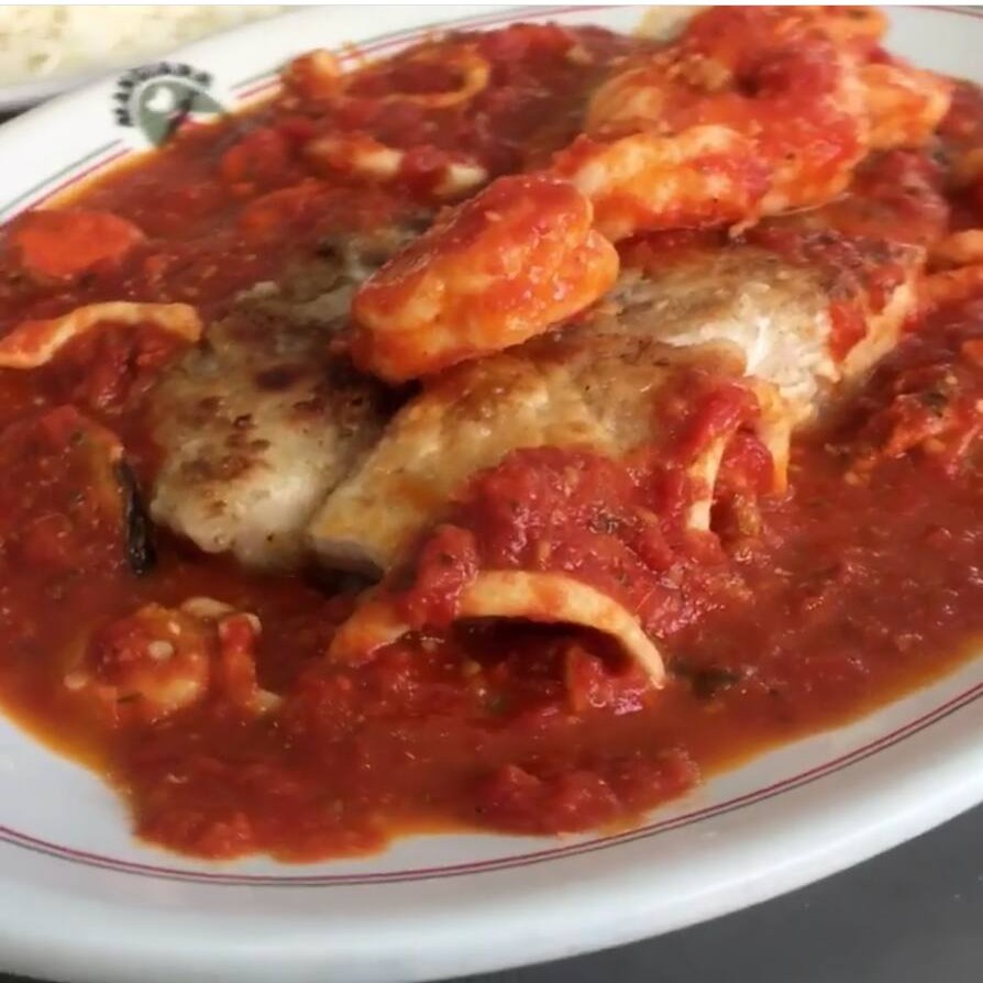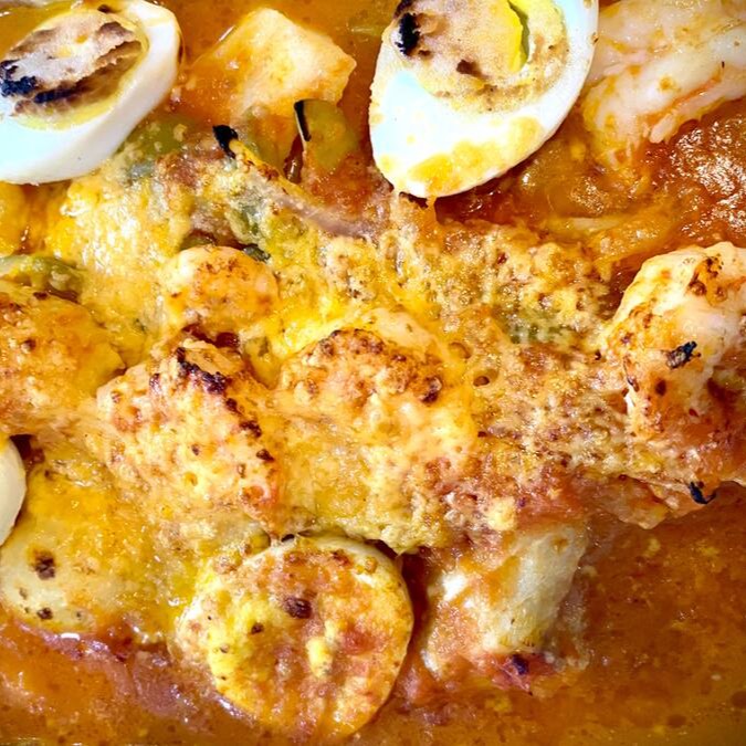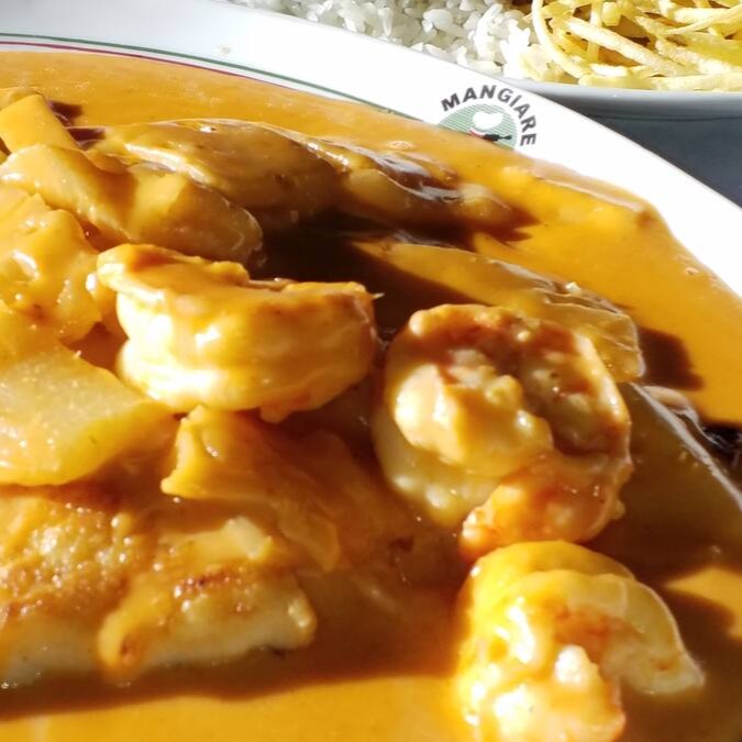 Molho de tomate, batata, cebola, ovo, camarões e azeitonas verdes. Acompanha arroz