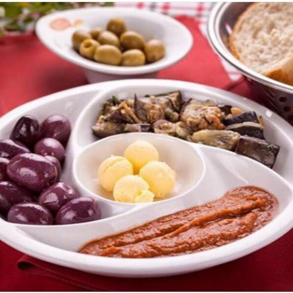 Pão italiano fatiado, manteiga, sardela, azeitonas, berinjela e mussarela de búfala