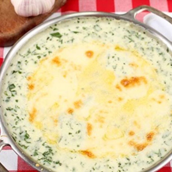 Creme de espinafre, nozes, uvas passas, gratinado com gorg. E Catupiry