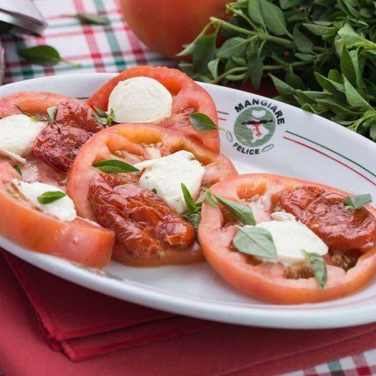 Tomate, muçarela de búfala, tomate seco e manjericão