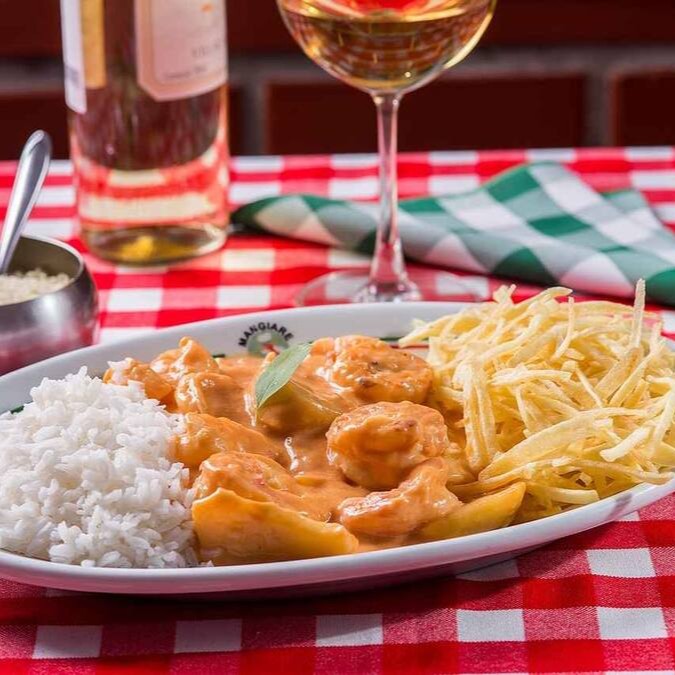Molho branco, camarão, champignon e Catupiry