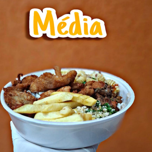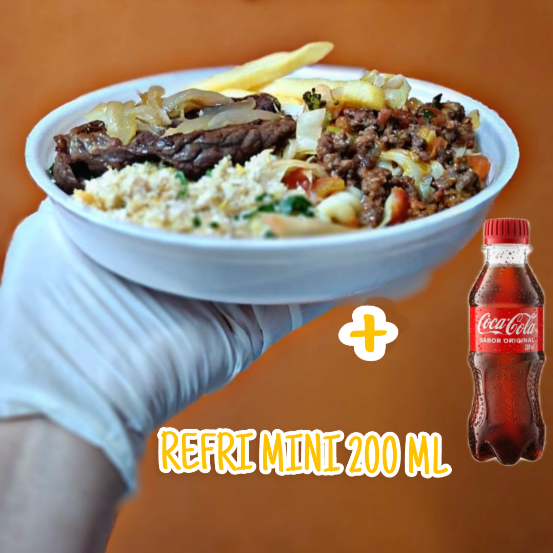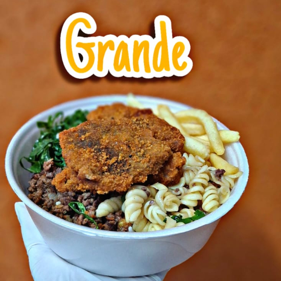 Arroz, feijão branco ou feijão preto ,batata frita , panqueca a bolonhesa ,farofa da casa , e carne a sua escolha.