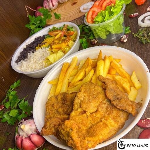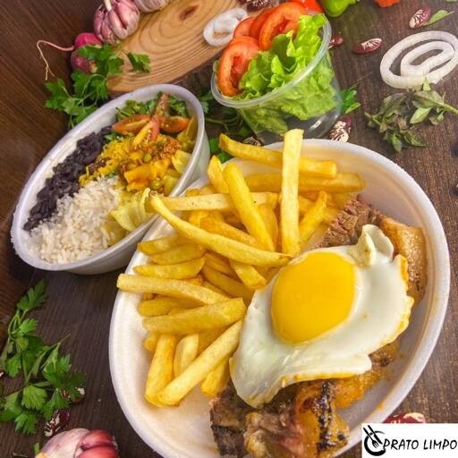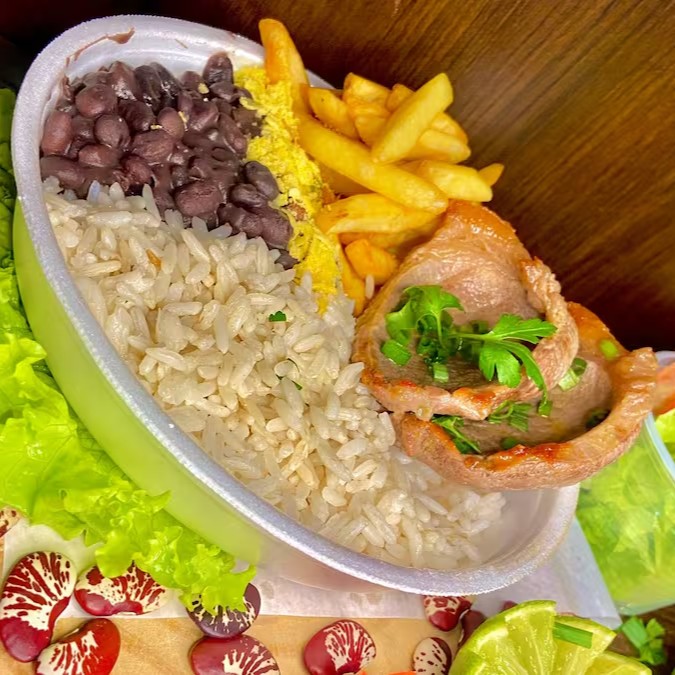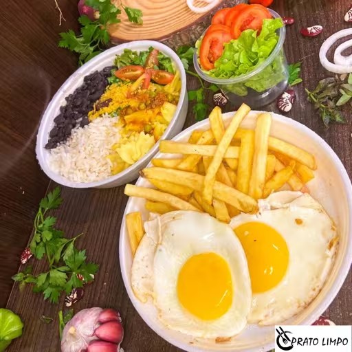 As batatas fritas crocantes adicionam um toque extra de crocância, enquanto a farofa saborosa traz um sabor caseiro que complementa a refeição. Para equilibrar o prato, uma salada fresca de folhas verdes oferece leveza e frescor, tornando cada garfada ainda mais especial.