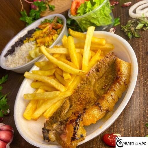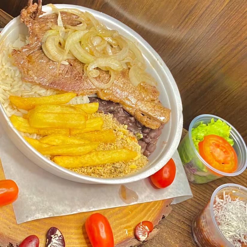 Bife grelhado no ponto certo, suculento e temperado com sabor caseiro. Acompanha arroz soltinho, feijão temperado, batata frita, farofa, salada fresca e sobremesa de cortesia.