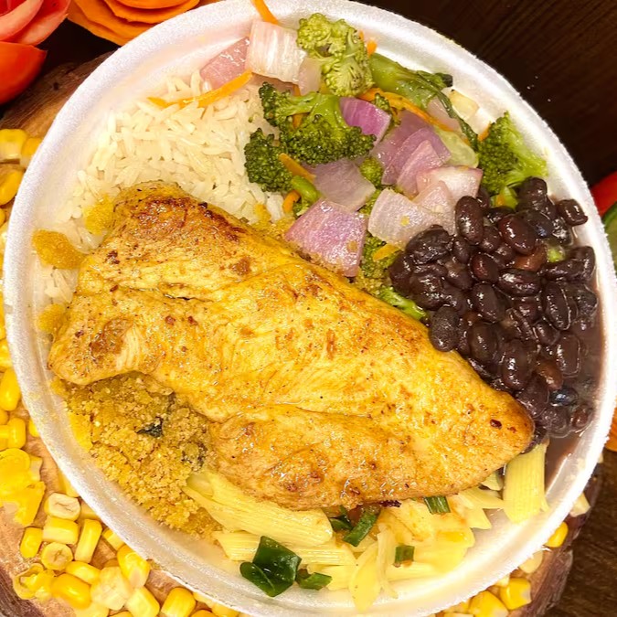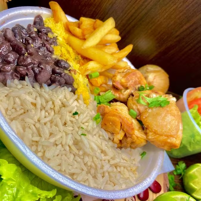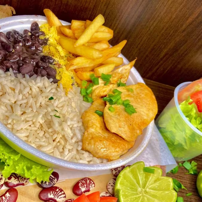 Acompanha arroz soltinho, feijão caseiro bem temperado, macarrão com molho refogado, farofa crocante e peito de frango grelhado no ponto ideal.