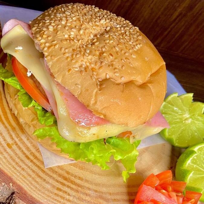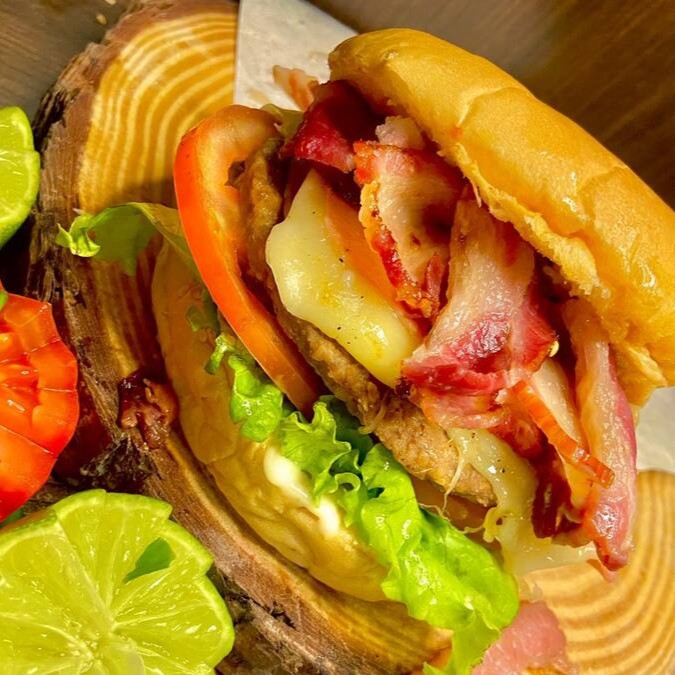 Um X-Bacon irresistível começa com um pão macio e levemente tostado, recheado com um hambúrguer suculento, queijo derretido, fatias crocantes de bacon, presunto, alface fresca e tomate. Cada mordida oferece uma explosão de sabores e texturas, combinando a suculência da carne, a cremosidade do queijo, a crocância do bacon e a frescura dos vegetais. É um clássico delicioso que satisfaz qualquer desejo.